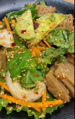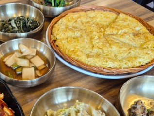 산들애 건강밥상의 코다리구이 정식은 반건조 명태를 은은한 불로 구워 겉은 바삭하고 속은 촉촉한 식감을 살린 것이 특징입니다. 정식으로 제공되기 때문에 메인 반찬 외에도 밑반찬 구성과 비빔밥 선택 옵션이 있어 한 끼의 균형감을 갖춘 상차림을 경험할 수 있습니다. 간이 강하지 않으며, 반찬 및 밥 양이 넉넉하다는 후기가 많습니다.